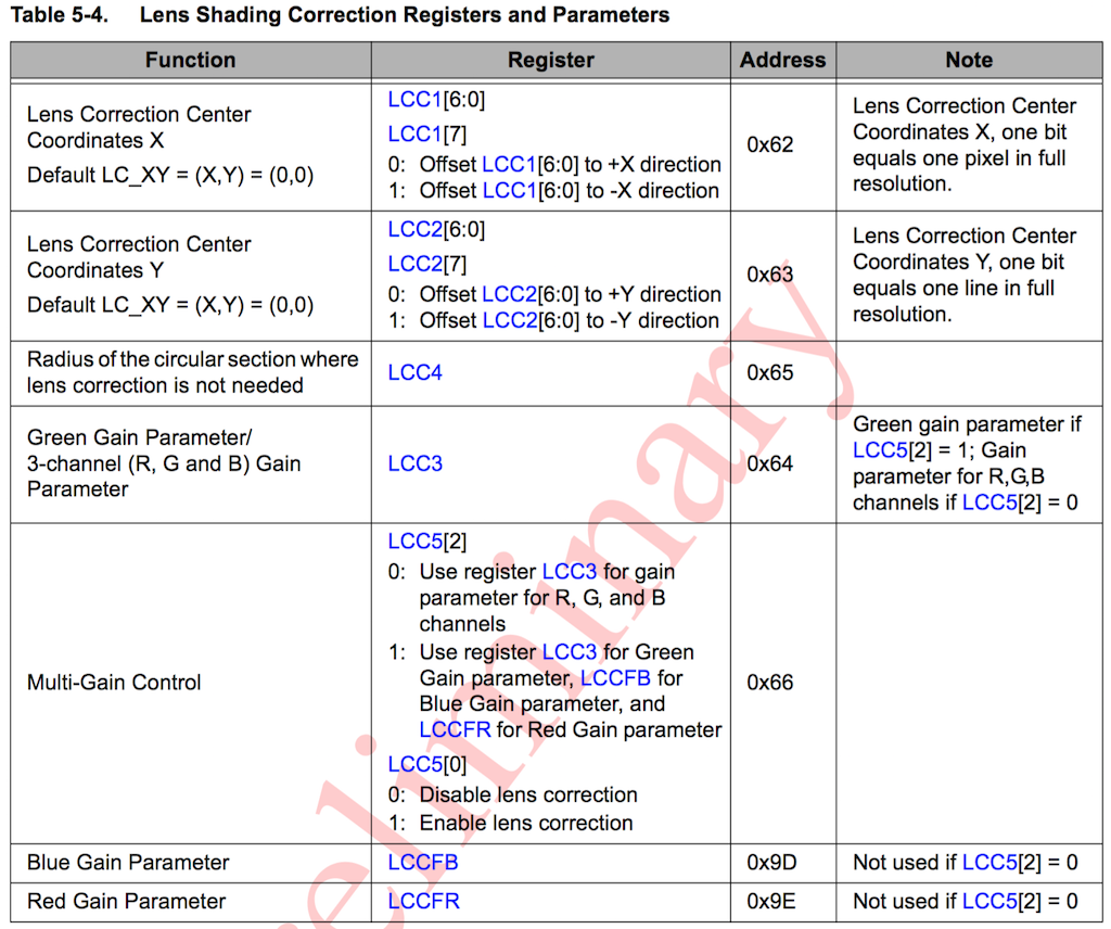 Notably, register LCC3 (0x64) sets the gain (strength of correction) and LCC4 (0x65) sets the radius of the central no-correction disk. Instead of a single gain parameter, one can also instead, through register LCC5 (0x66) specify 3 different gains for Red, Green, and Blue (then using registers LLC3 (0x64) for green, LCCFB (0x9d) for blue, and LCCFR (0x9e) for red).